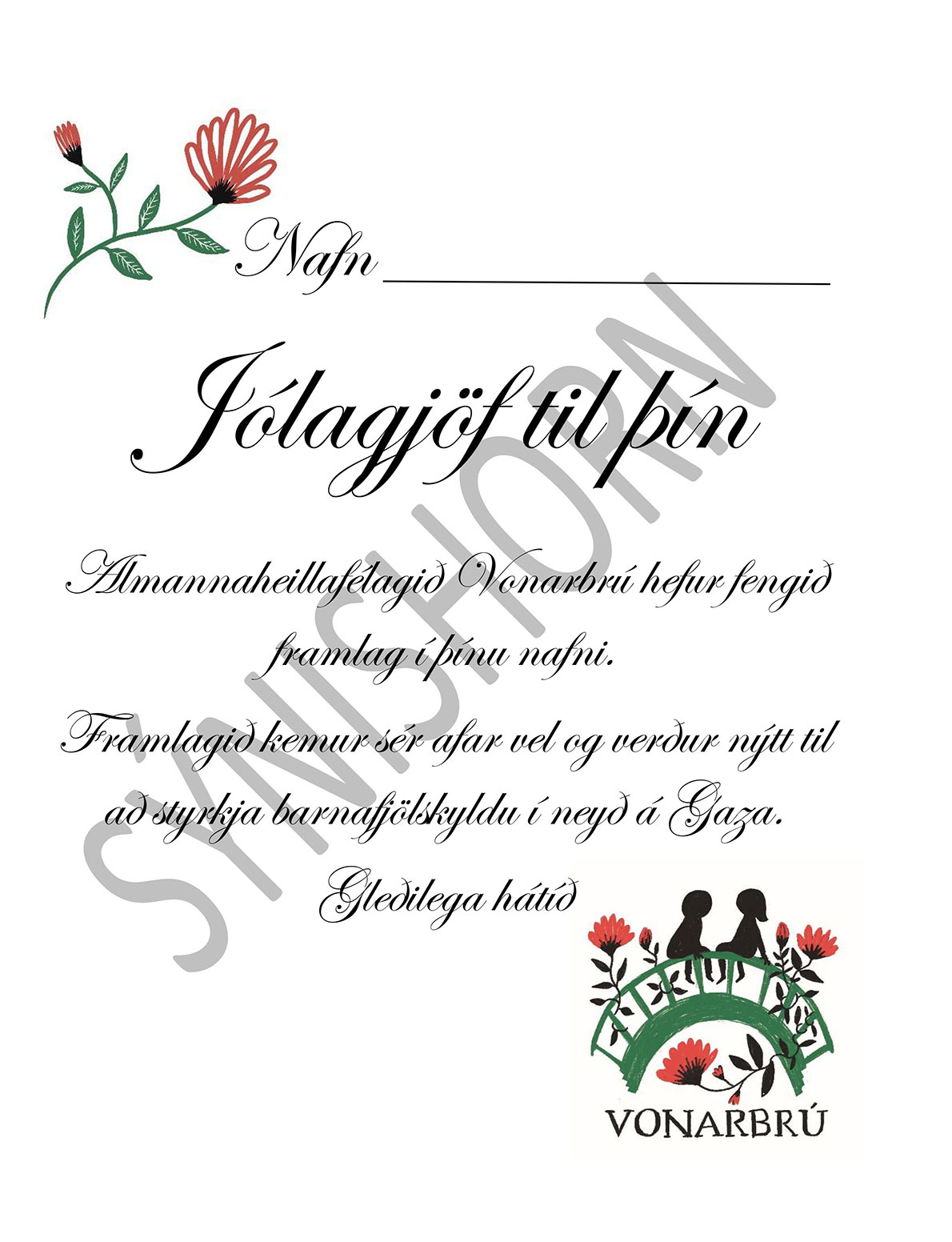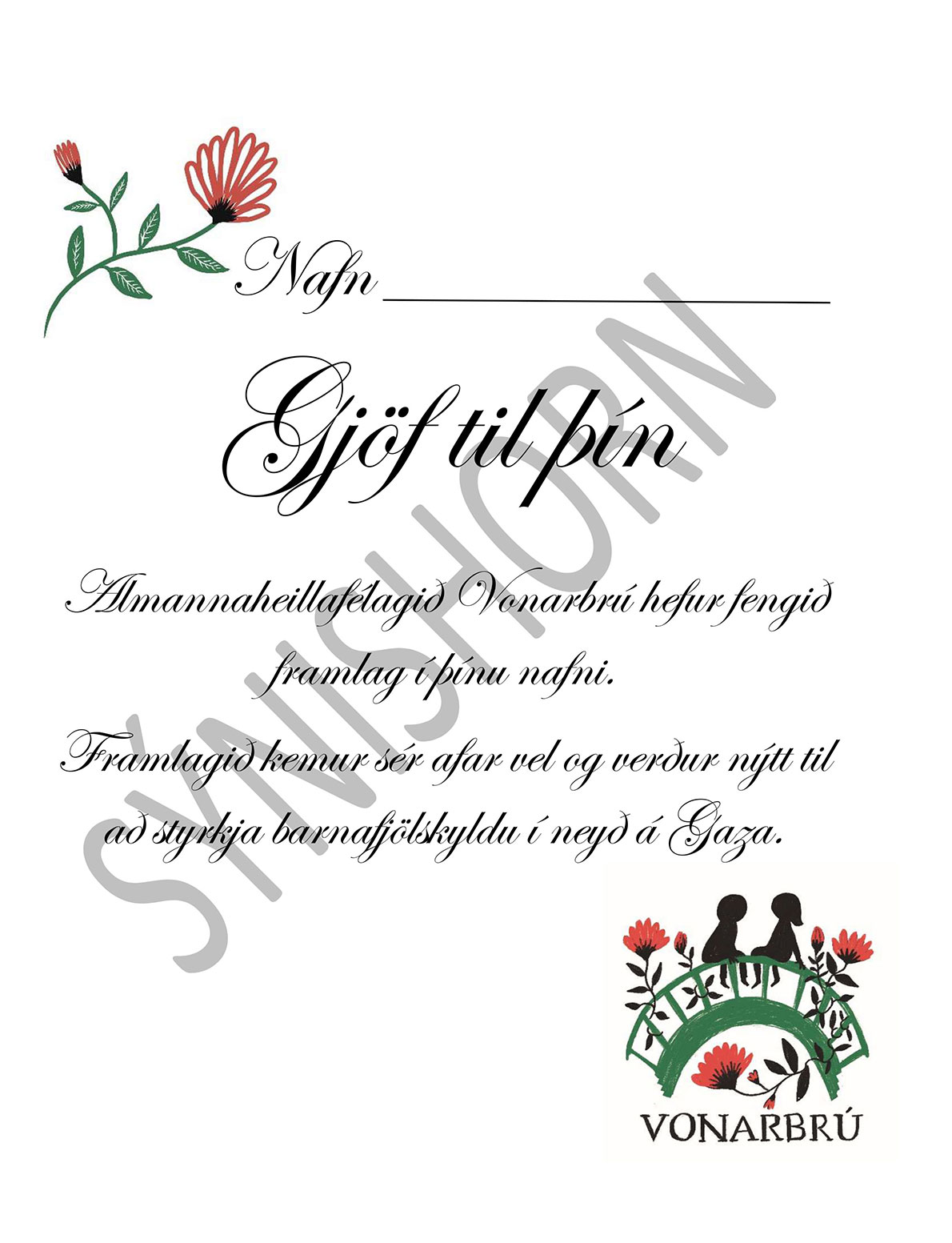 Gjafabréf til styrktar Vonarbrú – Almannaheillafélagi, sem styrkir ungar fölskyldur á Gaza